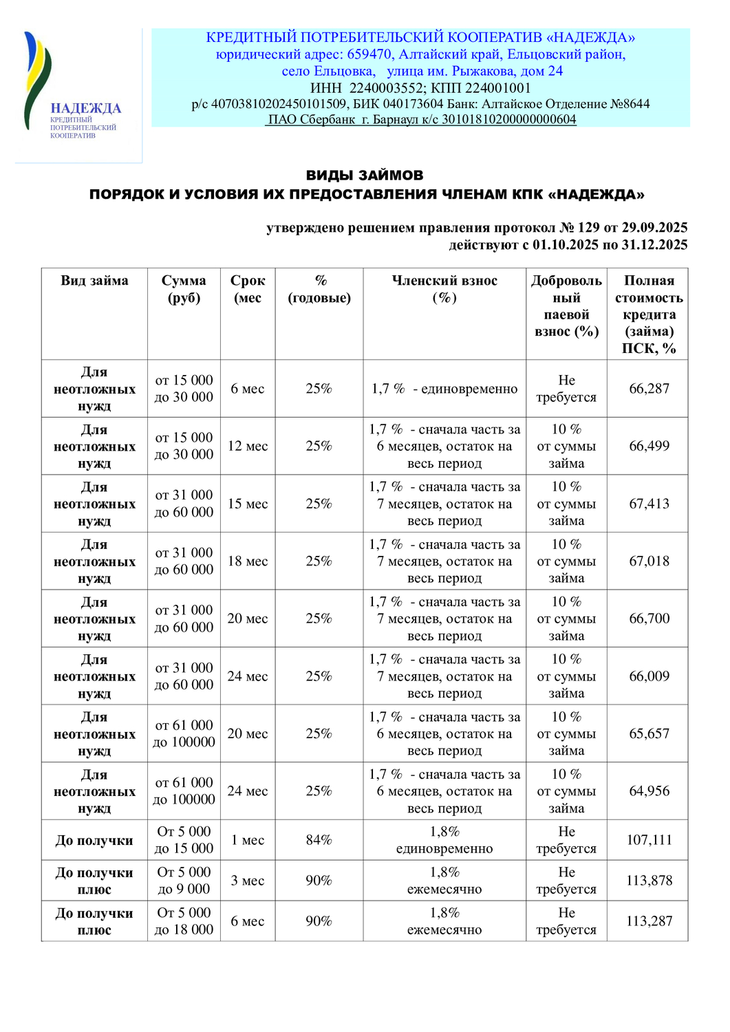 Оплата займов может быть произведена на расчетный счет кредитного потребительского кооператива "Надежда"