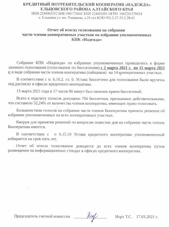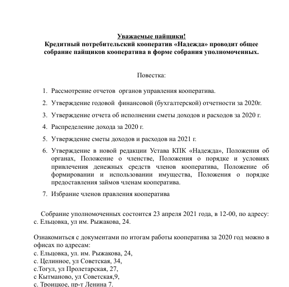 Ознакомиться с документами по итогам работы кооператива за 2021 год можно с 9-00 до 17-00 чч. в офисах по адресам: с. Ельцовка, ул. им. Рыжакова, 24,