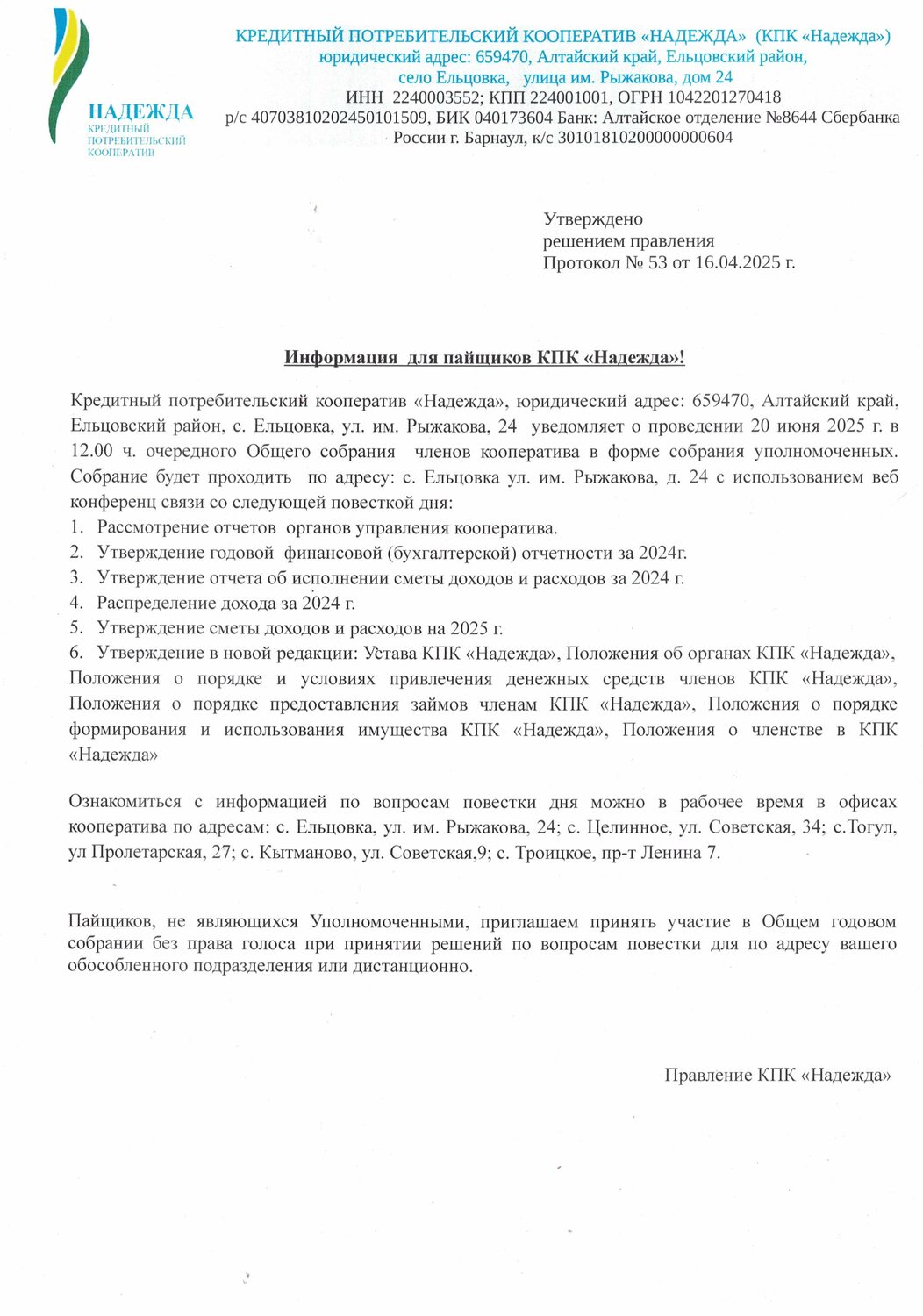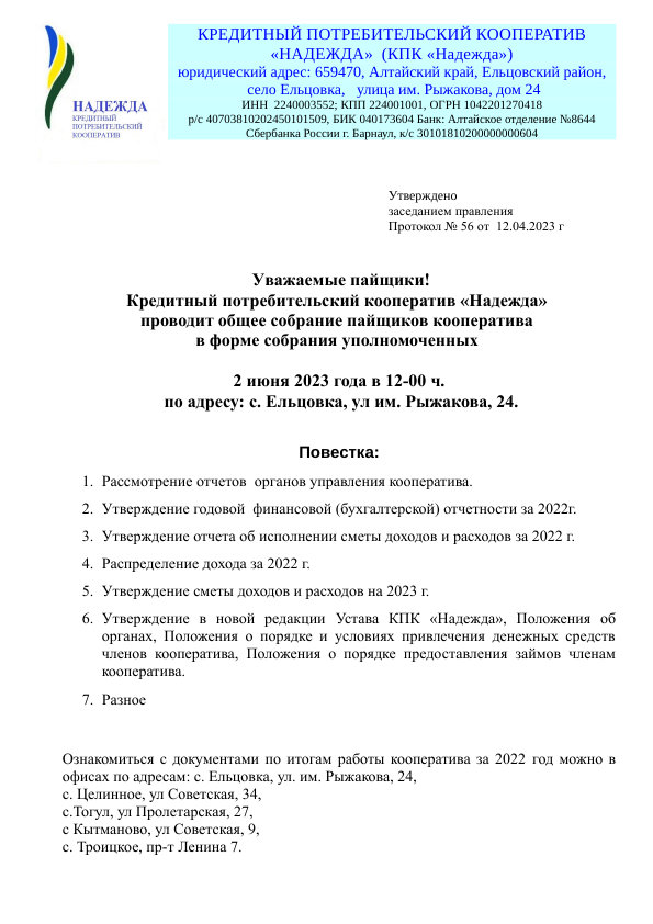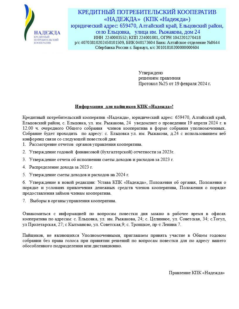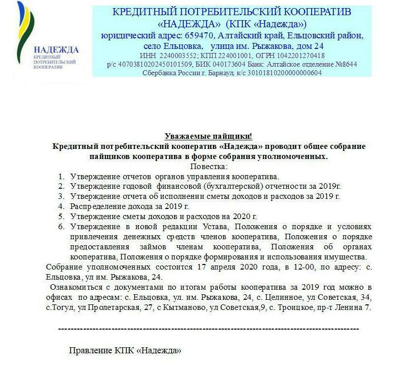 Собрание уполномоченных состоится 31 мая 2022 года, в 12-00, по адресу: с. Ельцовка, ул им. Рыжакова, 24.
